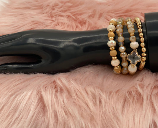 4 Row Wood & Beads Clover Bracelet (White/Gold)